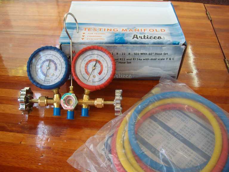 Manifold R12-R22-R134-R502. Incluye: Visor de liquido, 3 mangueras, 90 cm, manometro con protectores más gancho para colgar